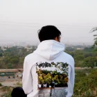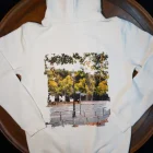 This pure white hoodie embodies calmness and simplicity, offering a serene escape from the chaos of everyday life. The back print beautifully depicts a quiet street road, surrounded by lush trees and greenery, now still and empty—a symbol of peace, solitude, and reflection.
