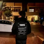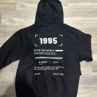 This hoodie is a black streetwear garment with a minimalist yet bold graphic design on the back. The central feature is the year “1995,” surrounded by a square frame, creating a focus point. Below the year, there’s a slogan, “ROCK THE WORLD,” accompanied by motivational text: “Make the best out of your talent. Bring the best of you.”